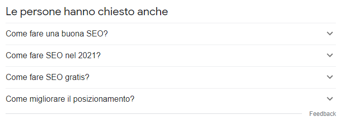 Snippet con le domande più comuni poste dagli utenti per la query "Come implementare una strategia di SEO"