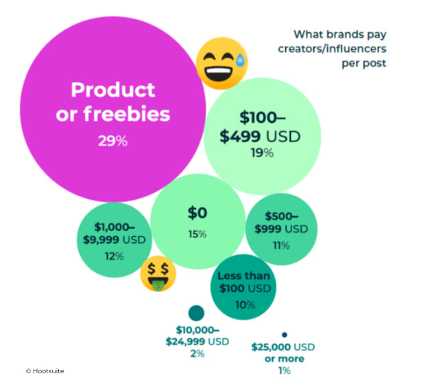Inoltre, a differenza di ciò che si potrebbe pensare, lavorare con gli influencer non è così costoso: gli intervistati hanno dichiarato che la maggior parte dei creatori viene pagata meno di $100 a post.