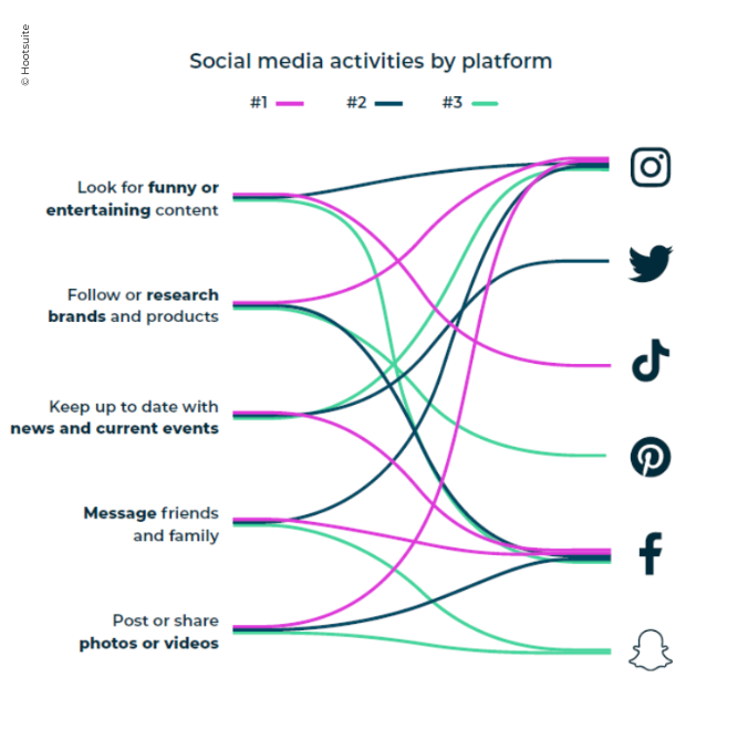Questa continua evoluzione e omologazione delle piattaforme porta non pochi problemi ai social media managers che, oltre a doversi adattare costantemente ai nuovi formati lanciati dalle piattaforme, devono anche comprendere come veicolare nel modo corretto i contenuti. Perché se è vero che i formati sono gli stessi su ogni piattaforma, è anche vero che la maggior parte degli utenti ha in media più di un account social e utilizza le singole piattaforme per scopi differenti. Infatti, oltre l'84% degli utenti di TikTok è anche su Facebook e quasi l'88% degli utenti di Twitter possiede anche un account su Instagram. Facebook viene però utilizzato per rimanere in contatto con la propria cerchia di amici, Twitter per rimanere aggiornati sulle ultime notizie; mentre TikTok ed Instagram come fonte di intrattenimento e divertimento.