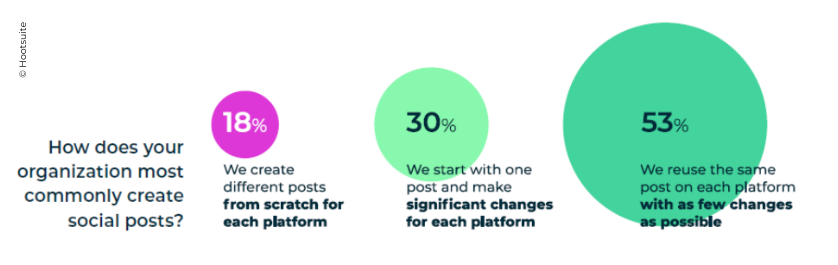 Per questo motivo è fondamentale prestare attenzione non solo ai formati in tendenza in quel determinato momento, ma anche a catturare l’attenzione degli utenti offrendo loro un’esperienza unica e diversificata. Ecco quindi che riproporre gli stessi contenuti sulle diverse piattaforme non è la strategia ottimale per riuscire a coinvolgere il pubblico. Tuttavia, soltanto il 18% dei marketer crea post diversi da pubblicare su ciascuna piattaforma. Più del 50% degli intervistati al sondaggio di Hootsuite ha invece affermato di pubblicare contenuti su più piattaforme social con il minor numero di modifiche possibile.