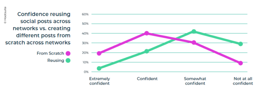 Se il cross-posting fa risparmiare parecchie risorse in termini di tempo, non è detto che porti ai risultati sperati e anche i marketer ne sono consapevoli in quanto essi affermano di essere molto più fiduciosi di raggiungere un risultato quando creano post diversi per singola piattaforma.