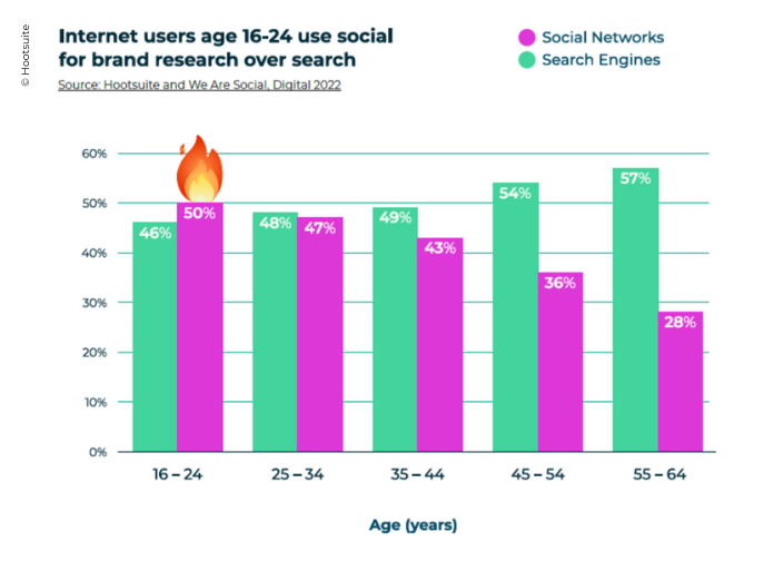 Al momento si tratta soltanto di una piccola fetta di pubblico in quanto gli utenti con età maggiore di 25 anni continuano a preferire i motori di ricerca quando si tratta di ottenere informazioni su brand, prodotti e servizi. Il passaggio da web a piattaforme social sarà un processo lungo e generazionale. Nel 2023 è quindi consigliabile che i marketer continuino a focalizzarsi su tutte le opportunità che i motori di ricerca offrono, ma che al tempo stesso inizino a padroneggiare le basi dell'ottimizzazione della ricerca social. Come?