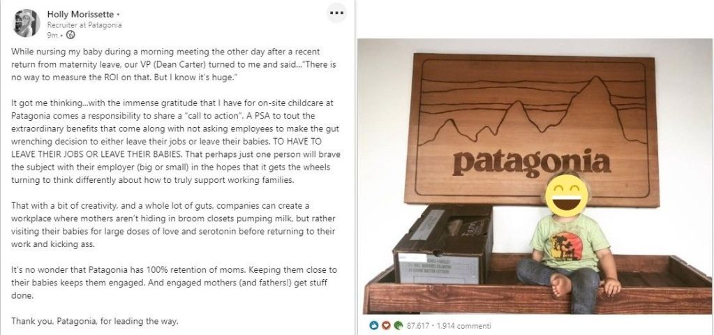 Formare il personale, promuovere politiche ambientali, sociali, d'integrazione, di supporto alle famiglie, di solidarietà sono altre scelte che possono motivare il personale e stimolarne il senso di appartenenza all'azienda. Ad esempio, attraverso un post sul proprio profilo LinkedIN, una dipendente Patagonia ha pubblicamente ringraziato il marchio per le sue politiche di supporto alle famiglie. Il post è diventato virale sul social network ed è stato citato come esempio di comportamento a tutela delle madri lavoratrici da più fonti online.