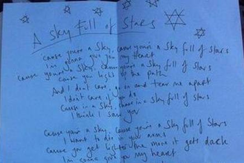 Una dei manoscritti di Chris Martin con il testo della canzone