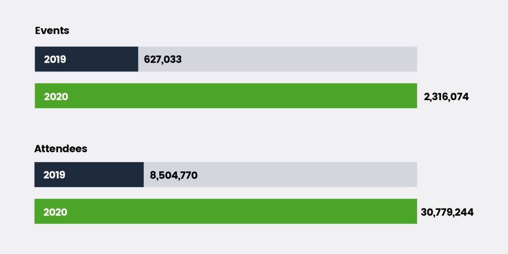 Il numero di eventi online organizzati sulla piattaforma webinar ClickMeeting nel 2019 vs 2020.