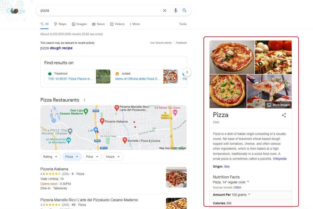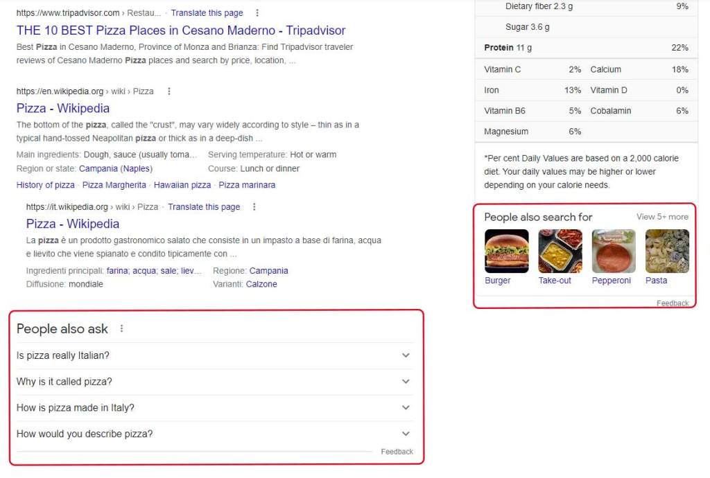 La SERP di “Pizza” restituisce diversi box con approfondimenti relativi alla query.