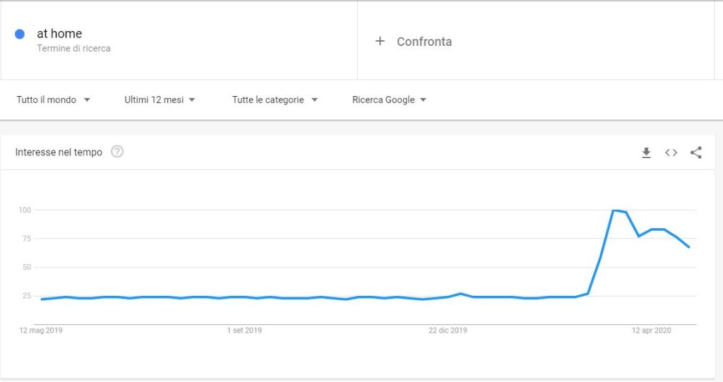Il grafico di Google Trends mostra come sia aumentata la query di ricerca del termine “at home” nel mondo negli ultimi 12 mesi.