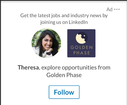 Annunci Follower: annunci dinamici per invitare i membri di LinkedIn a seguire la nostra pagina aziendale.L’annuncio è personalizzatocon il nome e la foto profilo di chi lo sta visualizzando.