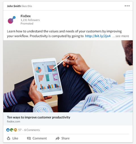 Annunci con immagine singola: appaiono nel feed dei membri di LinkedIn con un breve testo, un’immagine e una CTA.