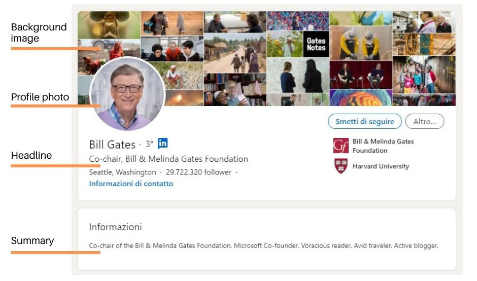 Un profilo curato e professionale parte dalla scelta di una foto profilo altrettanto curata e professionale. Lasciamo quindi perdere foto con occhiali da sole o scatti delle vacanze: scegliamo una foto che ci rappresenti, senza per forza essere seriosa, ma che trasmetta un’immagine consona al mondo del lavoro.