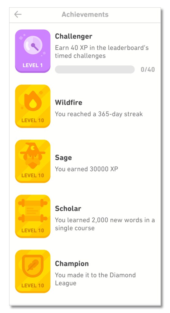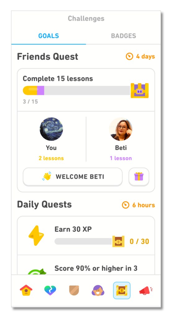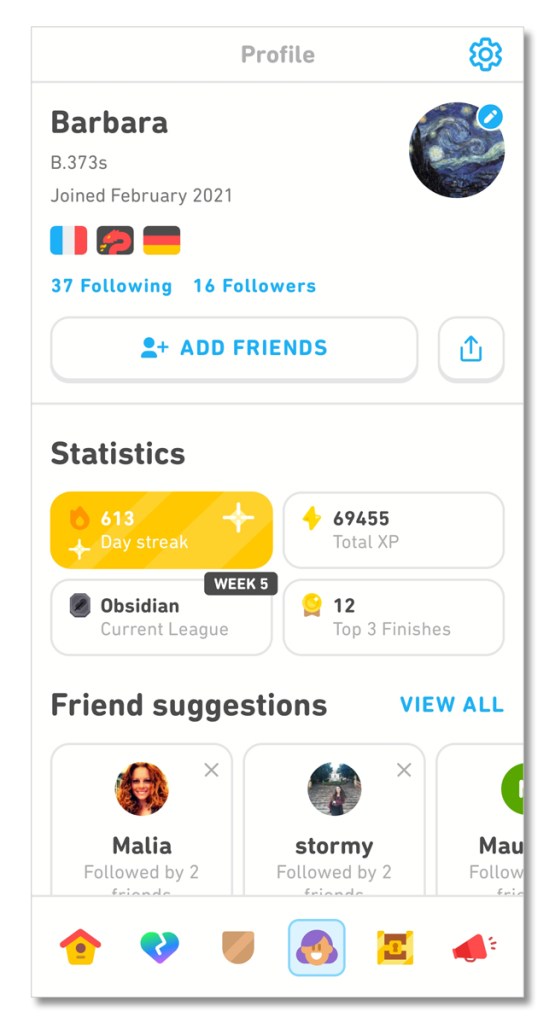 Una delle regole d’oro della gamification è tracciare e celebrare i progressi fatti. Duolingo fa ciò in diversi modi.