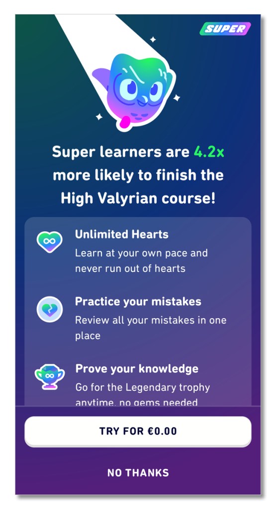 Anche per promuovere la versione a pagamento dell’app, Duolingo fa leva sulla curiosità dell’utente di esplorare nuove e più complete funzionalità, nonché sul senso d’impazienza di completare il corso.