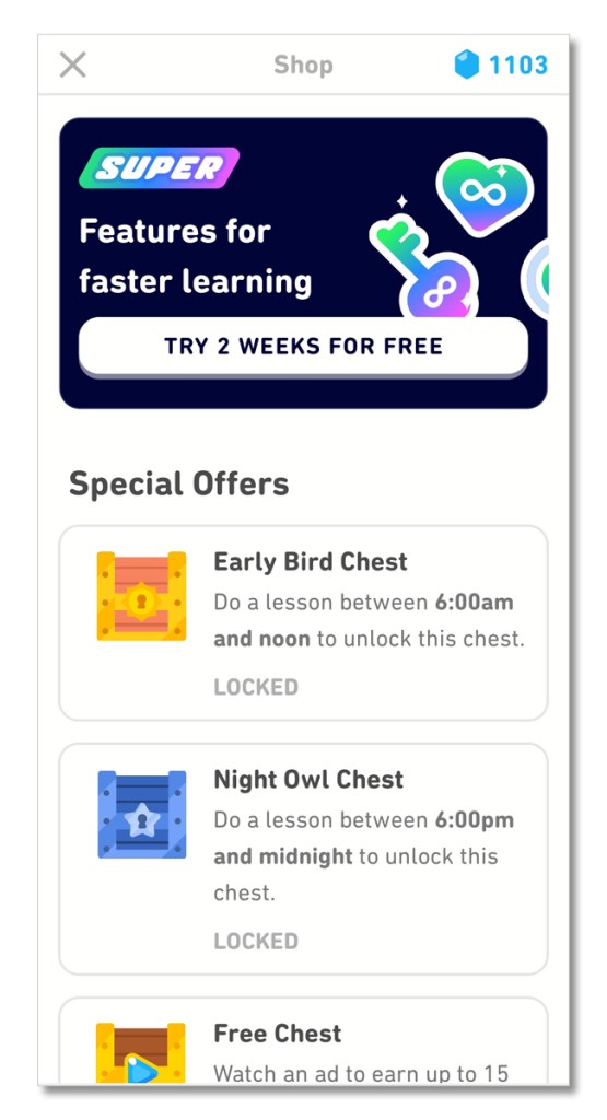 Duolingo fa ulteriormente leva su questa attitudine. Ad esempio, ci sono dei forzieri contenenti speciali premi che l’utente può sbloccare soltanto completando una lezione in un determinato momento della giornata.