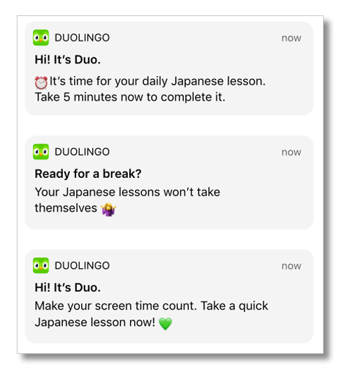 Duolingo invia diversi promemoria per invitare gli utenti a completare le lezioni. Nulla di nuovo da questo punto di vista. Tuttavia, lo fa in chiave ironica e motivazionale. Per quanto alcuni utenti siano sicuramente annoiati dal ricevere più notifiche al giorno in merito, molti altri si sentono spronati ad aprire l’app e divertiti dal tono irriverente di Duo.