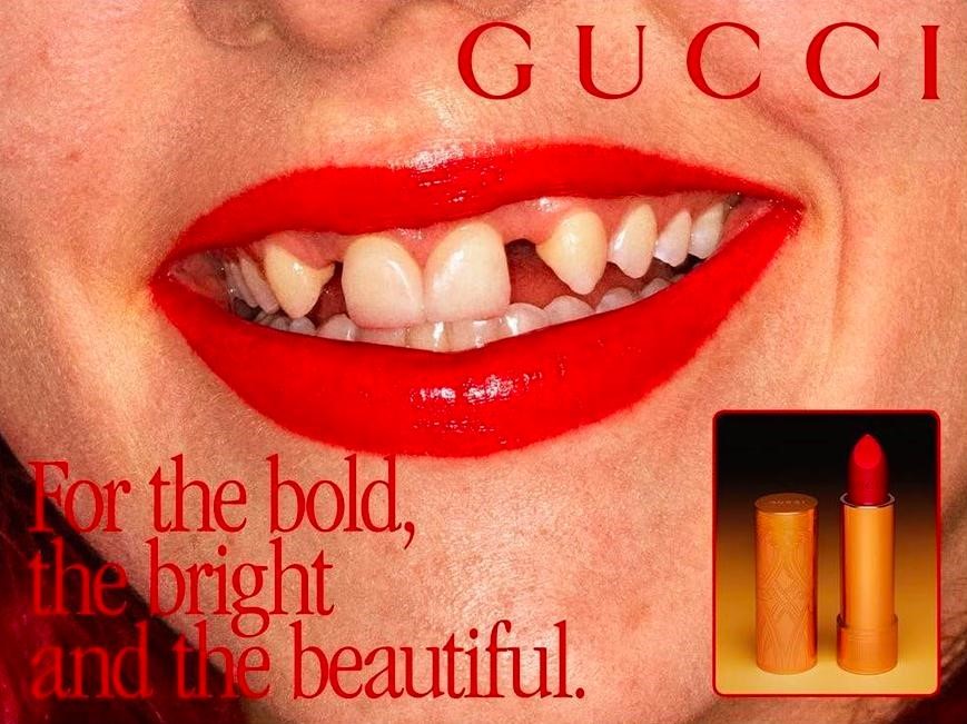 Anche la casa di moda italiana Gucci, per promuovere la sua nuova linea di rossetti, ha lanciato una campagna pubblicitaria che celebra la bellezza come imperfezione. La protagonista è Dani Miller, frontwoman dei Surfbort, la quale ha raccontato di essere stata bullizzata quando era una bambina a causa del suo sorriso irregolare. È stato proprio il suo sorriso “imperfetto” a farla diventare la testimonial della linea Beauty di uno dei brand più famosi al mondo.