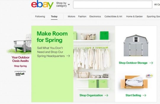 Ad esempio, il sito di vendita e aste online ebay ha sfruttato il principio della somiglianza: l’utilizzo di uno stesso colore di sfondo o di uno stesso colore e font per i testi, aiuta l’utente a riunire all’interno di uno stesso insieme articoli e categorie (shop organization, shop outdoor storage, start selling) diverse fra loro.