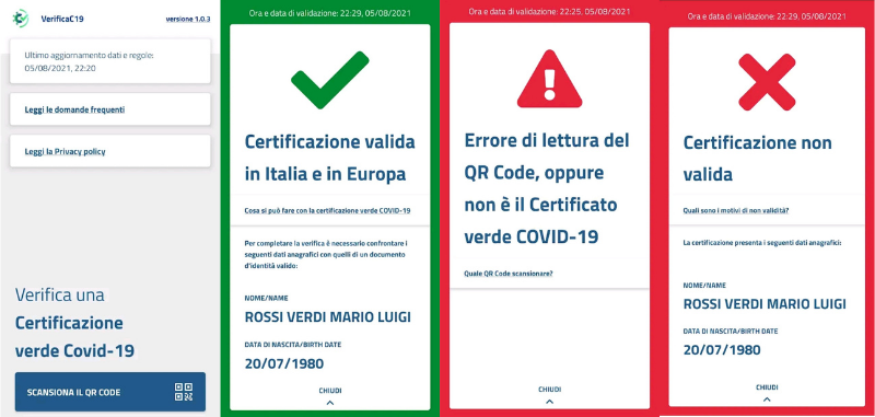 In Italia, la verifica del green pass deve avvenire mediante l’uso di VerificaC19, l’app sviluppata dal Ministero della Salute in collaborazione con il Ministero per l’Innovazione Tecnologica e la Digitalizzazione, il Ministero dell’Economia e delle Finanze e il Commissario Straordinario per l’Emergenza Covid-19.
