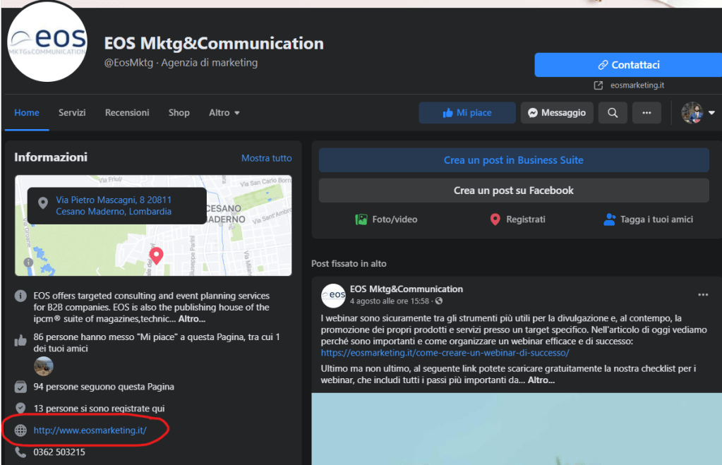 Backlink al sito di Eos contenuto sulla pagina Facebook.