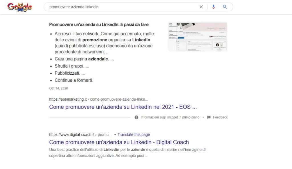 SERP della ricerca “promuovere azienda linkedin”. Attuare delle strategie di link building fa sì che il sito sia al primo posto, sopra ad altri che trattano dello stesso argomento. In questo addirittura come Featured Snippet.