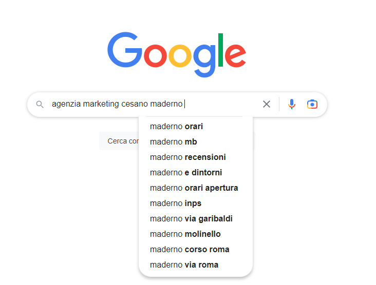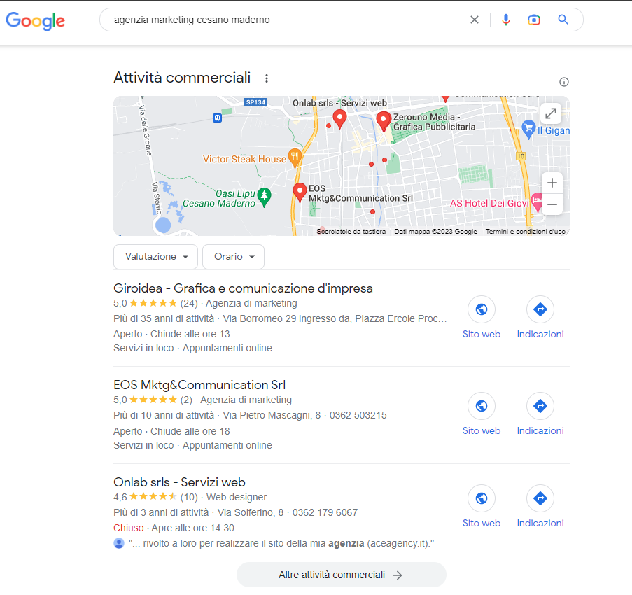 Ad esempio, se si cerca un’attività su Google, il motore di ricerca suggerisce subito risultati con la città più vicina al luogo in cui si effettua la ricerca, come visto in precedenza. Oppure, se si cerca un’attività con l’aggiunta della città, il motore di ricerca suggerirà ulteriori spunti per parole chiave ricercate dagli utenti, come orari e recensioni.