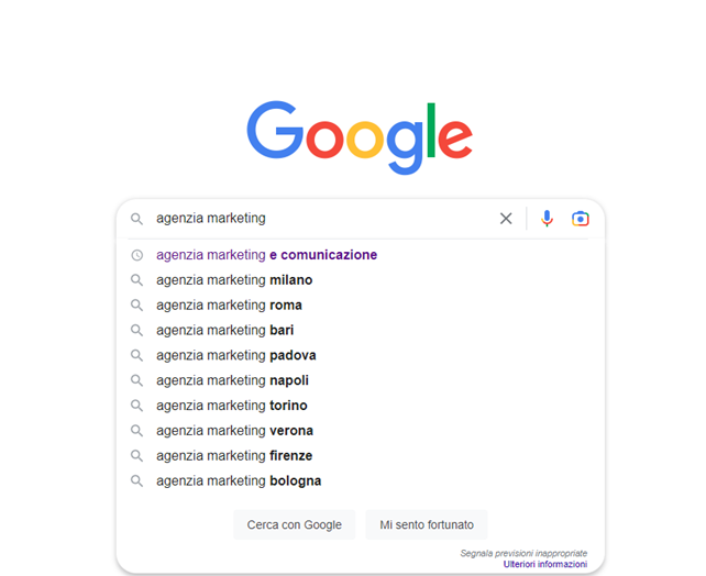 Un altro strumento utile è Google stesso: basta andare nella barra di ricerca e iniziare a scrivere qualcosa di inerente alla propria attività. Appariranno una serie di completamenti automatici per far risparmiare tempo agli utenti, prevedendo l’intento di ricerca. Questa funzione è molto valida per scoprire le parole chiave più lunghe, dette long tail keywords, composte appunto da più di una parola. Questo perché le previsioni del completamento automatico di Google dipendono anche dalla posizione geografica in cui si compie la ricerca.
