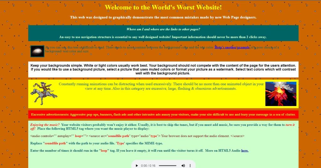 Gli spazi bianchi consentono, inoltre, all’utente di “respirare” tra una sezione e l’altra, senza sentirsi soffocare dalle informazioni. L’immagine seguente mostra ciò che è stato definito come il sito peggiore del mondo. Il susseguirsi di testi, colori, immagini e banner rende l’interfaccia troppo confusionaria e disordinata; il che non porta l’utente ad essere incuriosito e continuare la navigazione.