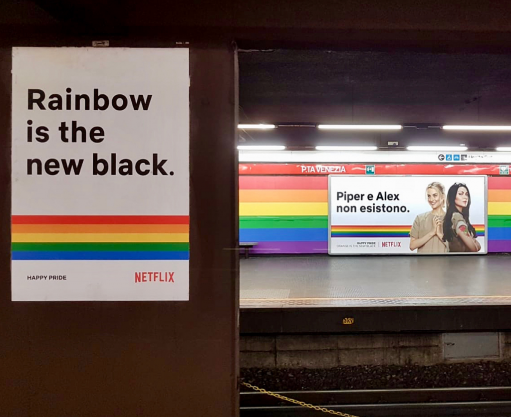 Nel 2018, in occasione delle celebrazioni del Pride di Milano, la stazione metro di Porta Venezia è stata invasa da cartelloni pubblicitari che recitavano a lettere cubitali “Rainbow is the new black”. Non solo, altri poster presenti nella stazione recavano foto di alcune famose coppie gay di serie Netflix, come Piper e Alex di Orange Is The New Black o Lito e Hernando di Sense8. Sotto le foto, i nomi dei personaggi con la scritta “non esistono”. Quest’ultimo era un riferimento diretto alle parole dell’allora Ministro delle Famiglie, Lorenzo Fontana, che in un intervista al Corriere della Sera aveva dichiarato